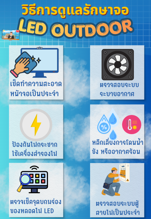 จอ LED Display ภายนอกอาคาร (Outdoor) เป็นอุปกรณ์ที่ต้องเผชิญทั้งแดด ฝน ฝุ่น ความชื้น และไฟกระชากโดยตรง หากไม่มีแผนดูแลรักษาที่ถูกต้อง อาจทำให้อายุการใช้งานสั้นลง สีเพี้ยน ความสว่างลดลง หรือเกิดความเสียหายของระบบไฟฟ้าได้ก่อนเวลาอันควร